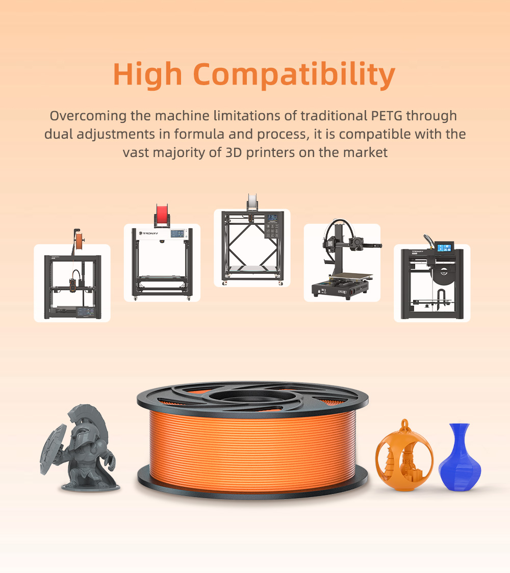 - Good Processability: The printing process for HS PETG is relatively simple, offering printability similar to PLA, but with fewer warping and delamination issues than ABS. Its low viscosity and excellent adhesion properties result in smooth, detailed printed parts. It exhibits good thermal stability during printing, is virtually odorless, and is less prone to clogging, contributing to printer cleanliness and stable operation. It also possesses good fire resistance.