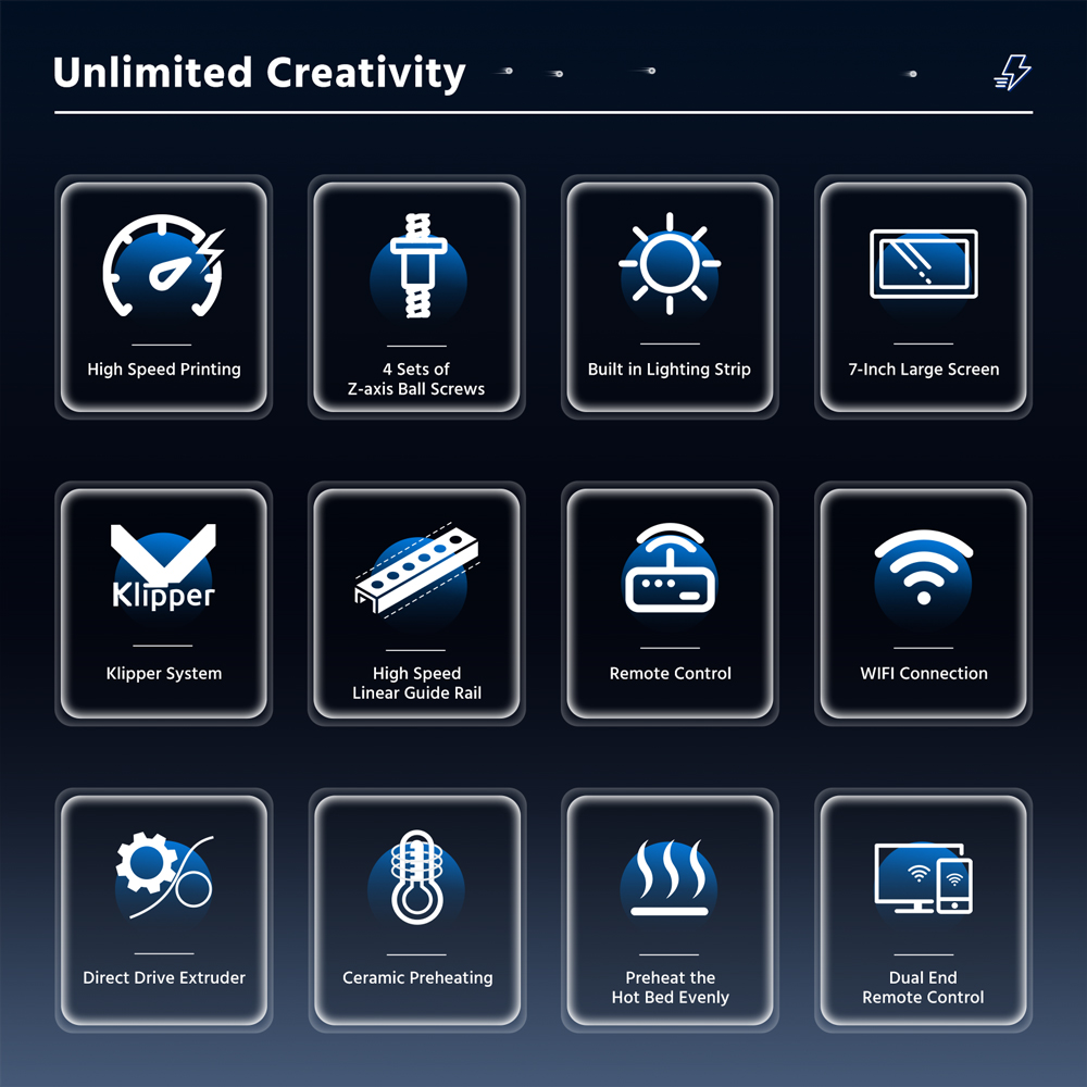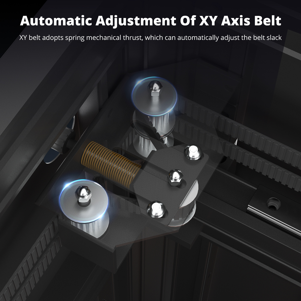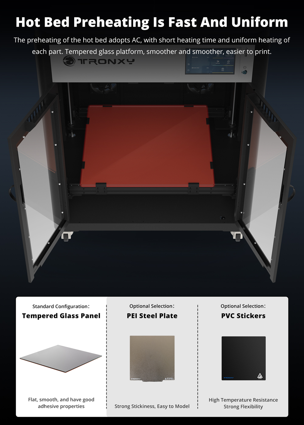 - Silicone heating bed + tempered glass panel