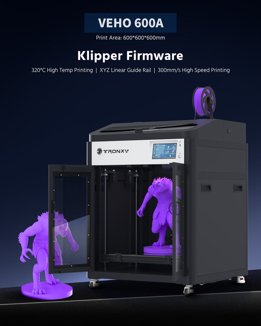 Tronxy VEHO 600A Full Enclosure With Klipper Firmware Direct Drive Extrusion 3D Printer Large Print Size 600*600*600mm Item NO.: 2720610
