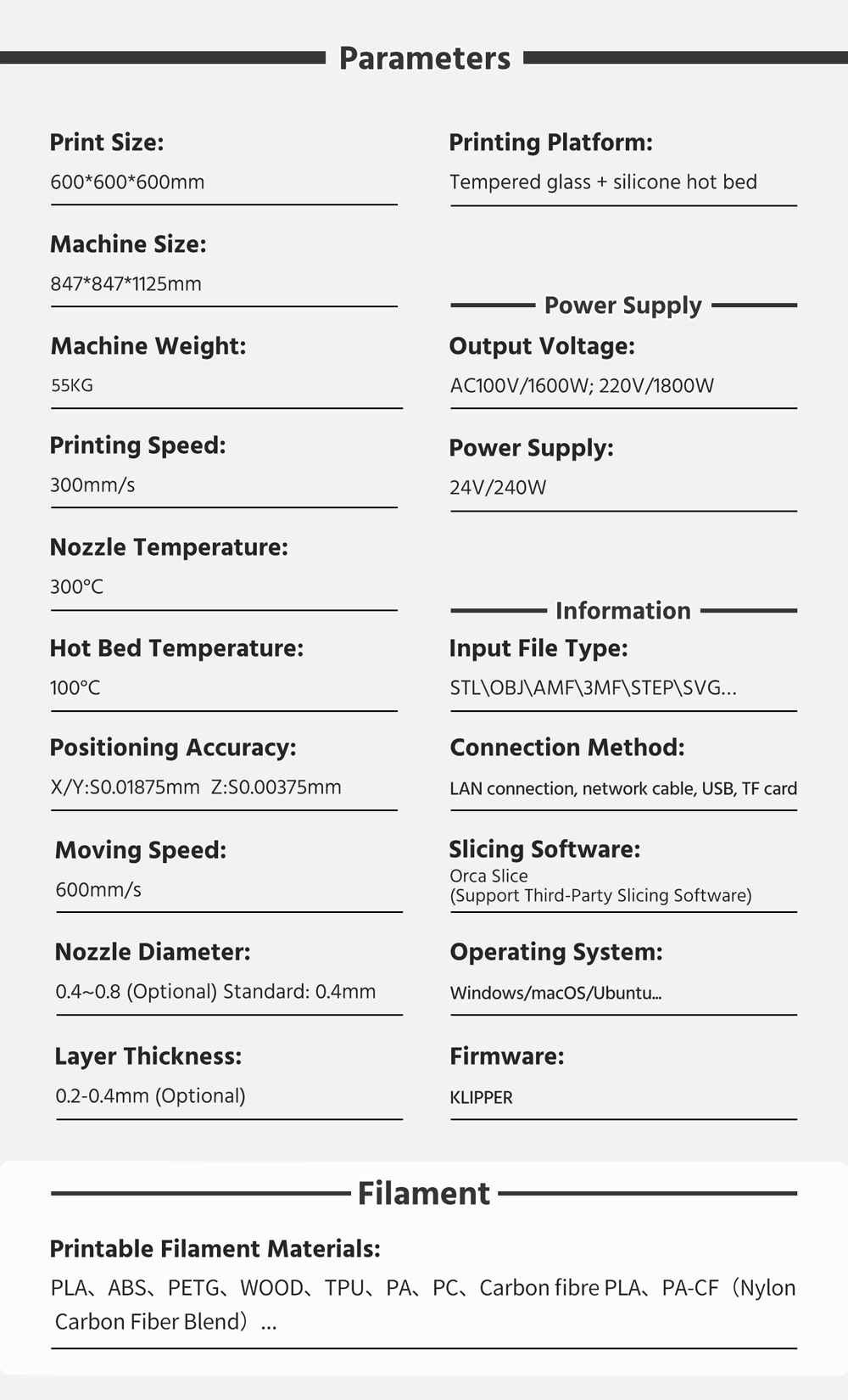 Copy| Product Name | Tronxy VEHO 600A Full Enclosure With Klipper Firmware Direct Drive Extrusion 3D Printer Large Print Size 600*600*600mm |